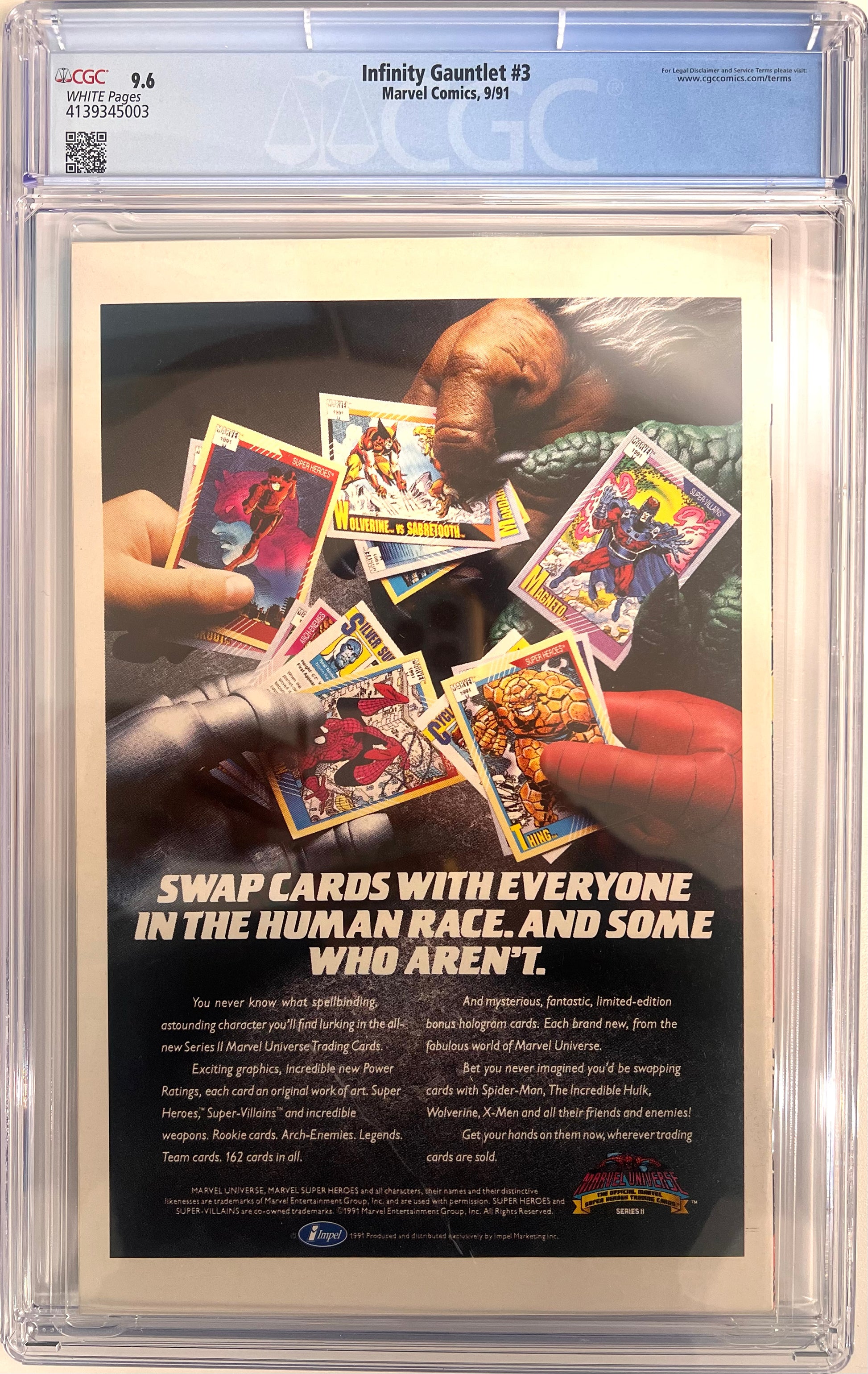 Step into the cosmic arena with Infinity Gauntlet #3, graded an epic 9.6 by CGC and boasting pristine White Pages. This September 1991 classic, sealed in a certified CGC slab, promises to elevate your collection to legendary status while preserving the thrill of its original glory. Ready to wield ultimate power?